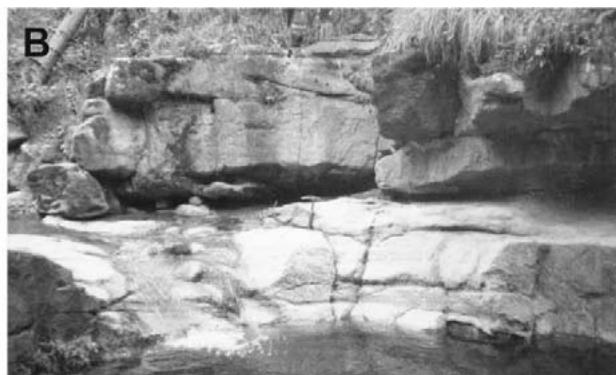 Figure 7: Outcrops of the Simón Formation, are observed conglomeratic sandstone with diastratiphication structures: A) Allende stream, Allende road, km 11 B) Yuni stream, San Juan Mixtepec road, km 6