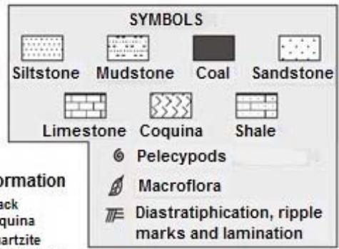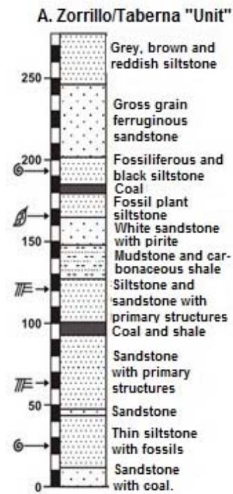 Lithology: Main rocks of the Zorrillo/Taberna "Unit" are carbonaceous siltstone (Fgi. 5A, B, C y D) and invertebrate and plants fossils. Is clear grey and dark grey color, predominantly first. The stratifications beds are middle to thick (30 to 40 cm width); upper beds are alternatively sandstone and argillaceous siltstone.