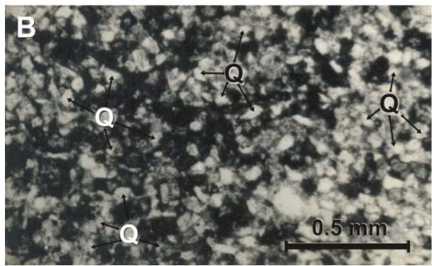 mica and ferromagnesian alteration; its matrix is argillaceous (Fig. 8B).