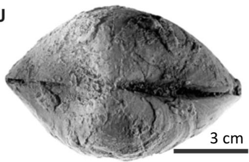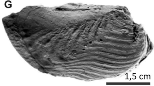 Figure 13: Specimens collected from the Zorrillo/Taberna "Unit". A) Zamites oaxacencis B) Zamites lucerensis, C) Williamsonia netzahualcoyotli, D) Ptilophyllum acutifolium, E) Lucina cf. L. bellona, F) Astarte sp., G) Vaugonia (Vaugonia) v-costata var. mexicana, H) Trigonia (Indotrigonia) impressa