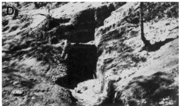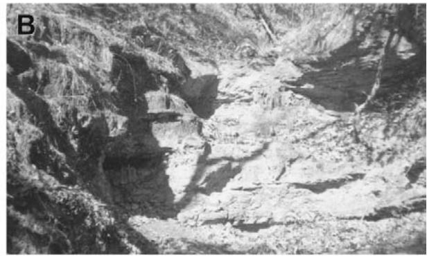 Figure 5: Outcrops of the Zorrillo/Taberna "Unit": A) La Carbonera Stream, show fine grained siltstone and sandstone, road to San Juan Mixtec, Km 6. B) Chicavandicuche Stream, show fine grain siltstone and sandstone, Idem km 6 C) Bridge on the Mixtepec road, show siltstone, Idem, km 8. D) Small Tunnel, show carbonaceous siltstone and lamination of coal, Idem, km 8.5