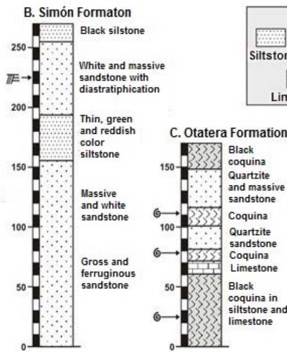 In the Numí River area this formation is located at south position, particularly where the Doña Chona Stream is. Its covering is short (Fig. 3). Lower beds interlayered with Otatera Formation and upper beds are discordantly overlay by Limestone with "Cidaris"; it is $\sim 118$ m width (Fig. 2). Reference Section was measured in the mentioned stream (Fig. 4D).