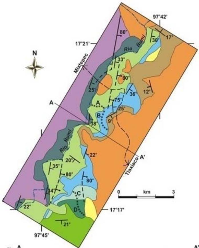 Figure 3: Geologic map and general structural section of the Numí River area, close to Tlaxiaco