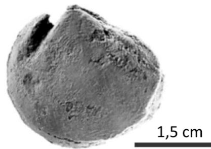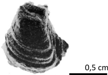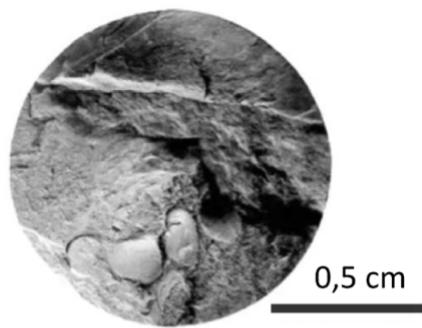 Lithology: Mostly of Otatera Formation is constituted by beds of black coquina of following genus of bivalves: Eocallista, Pleuronya, Crenotrapezium and ostracoda (Gryphaea), with sparite cement (Fig. 9). Coquina beds are mainly interlayered with calcareous beds of brown grey color, which consists of small fragments of calcspar and black color shells. Whole group of coquina are interlayered by thin beds of limestones from 4 to 5 cm width. Upper part is constituted of thin beds (1 to 20 cm width) of fine and gross grains of sandstones.