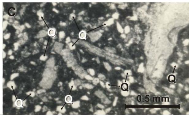 3) Biomicrite with silt quartzite. This characteristic variety, consists of bio clasts (30%) and micrite (40%) (Fig. 12C). Bio clasts typically are fragments of bivalves. Terrigenous clasts are $\sim 20 \mu \mathrm{m}$ size, they include parallel and wavy extinction quartz as well as lithic clasts (?ignimbrite).