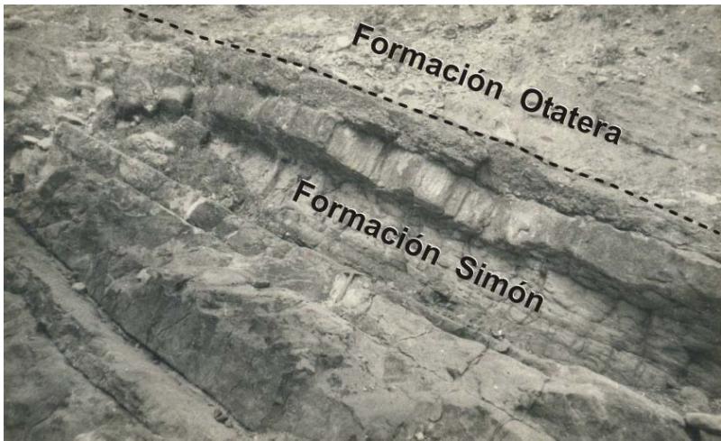 At the study area, Simón Formation is outcropping mainly in the Allende Stream where was measured the Reference Section (Fig. 4B). The lower contact is transitional with Zorrillo/Taberna "Unit", upper contact is not transitional but concordant with the Otatera Formation. The Simón Formation thickness is $\sim 270\mathrm{m}$.
