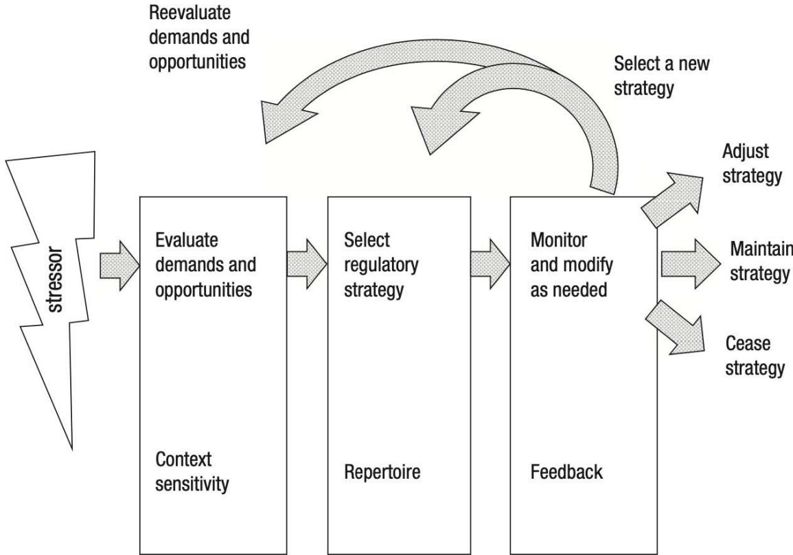 The regulatory flexibility model starts when a person faces a stressor. The first step they do is to evaluate it according to the context it is present. The efficacy of any behavior or strategy will tend to depend on context. This evaluation occurs over a background of ongoing appraisal processes involving general monitoring of goals (Carver & Scheier, 1982), mood and affect (Russell & Barrett, 1999), motivation (Ryan & Deci, 2000), and social interactions (Taylor, Wayment, & Carrillo, 1996). The perception is only as accurate as the context allows, and that is why there is room for flexibility as the model progresses. The individual evaluates the demands and opportunities in the situational context to find the ideal regulatory strategy.
