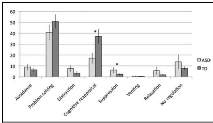 The next step is selecting a regulatory strategy. This is done from the repertoire of strategies available to the individual. As prior studies have shown, although children with autism use fewer emotion regulation strategies in general, they use more expressive suppression and less cognitive reappraisal than their typically developing counterparts (Samson et al., 2012, Jahromi et al., 2013). This finding persisted even after controlling for differences in emotional experiences and alexithymia (Samson et al., 2012). The same study showed that the efficacy of these strategies was equivalent in children and adolescents with autism and TD kids. Two charts from Samson's 2012 study below show the differences between autistic and typically developing adolescents and children in their emotion regulation techniques.
