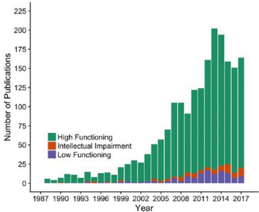 In many ways, Asperger's has been replaced by the term "high-functioning autism," which is a misnomer as it does not correspond with intelligence, just societal competence (A/VAres 2020). However, most studies increasingly focus on individuals with high-functioning autism. Alvares found that most publications focused/ relied on high-functioning individuals on the spectrum. A graph from her article is below. As we examine studies and try to make generalizations, this fact is important to note, as what we conclude might not apply to everyone on the spectrum.