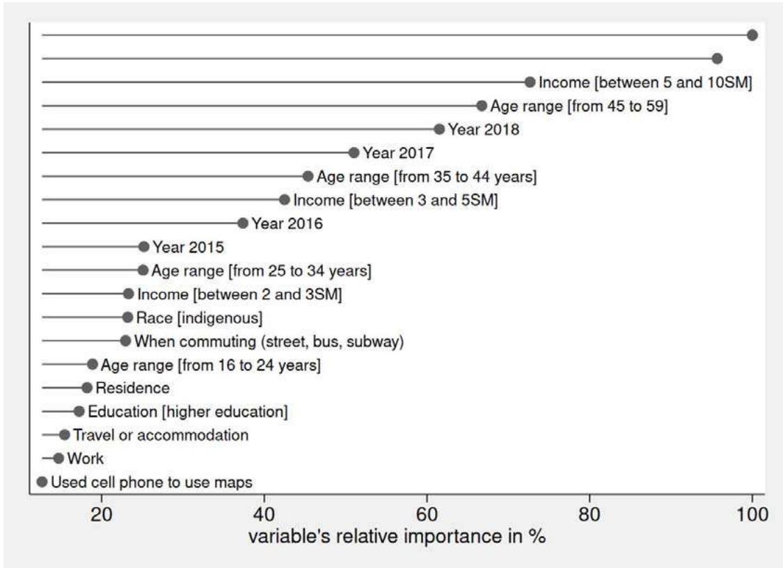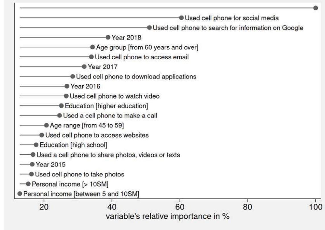 The attribute "used cell phone to send text messages" is the most important predictor for "internet access via cell phone", followed by "used cell phone for social networks" and "used cell phone to search for information on Google". The dominance of skill based measures is striking given that large parts of the literature highlighted the importance of socio-economic characteristics. Notwithstanding, age and education also appear among the list of the 15 most important characteristics for internet access via cell phone. The general effects of internet access in specific years are also among this list, confirming results from Silva et al. (2020) regarding the impact of business cycles on individual internet connections and affordability. Finally, the two highest income level groups rank at the bottom of our 20 selected variables in figure 1.