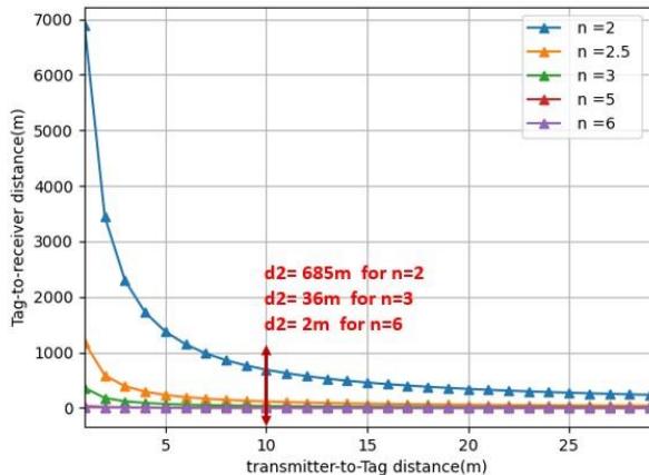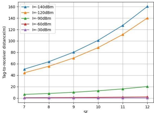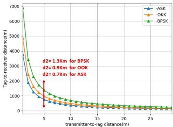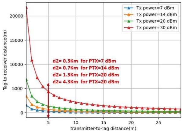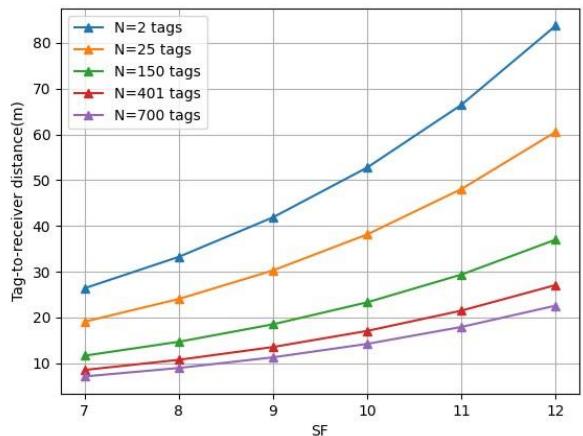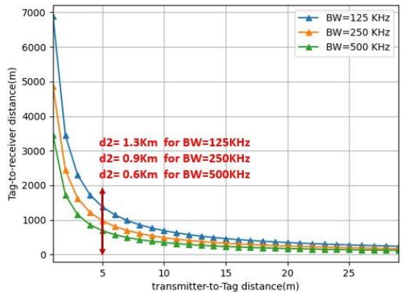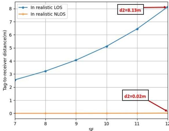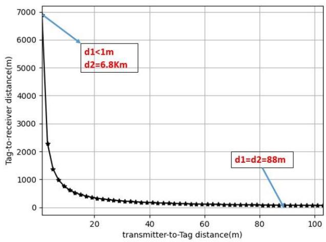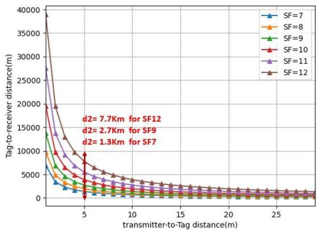 We can notice from Eq. (11) that the distance between RF tag and the receiver is inversely proportional to the transmitter-to-tag distance. Additionally, an increase in the spreading factor leads to an increase of distance $d_{2}$.