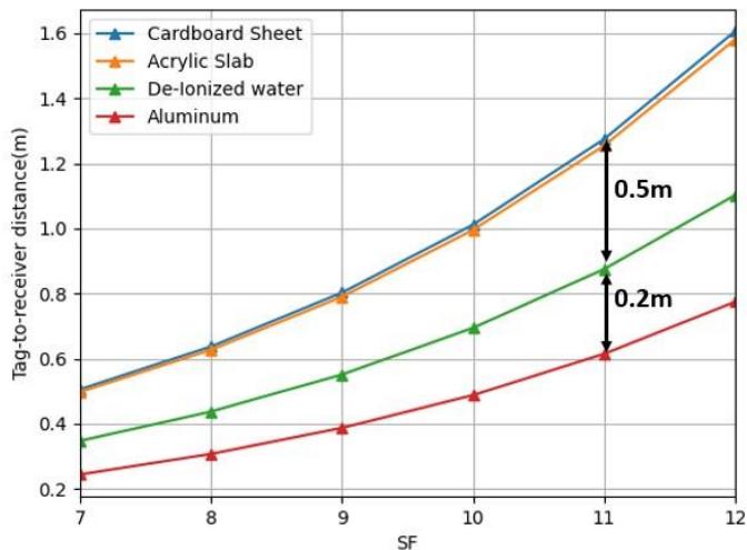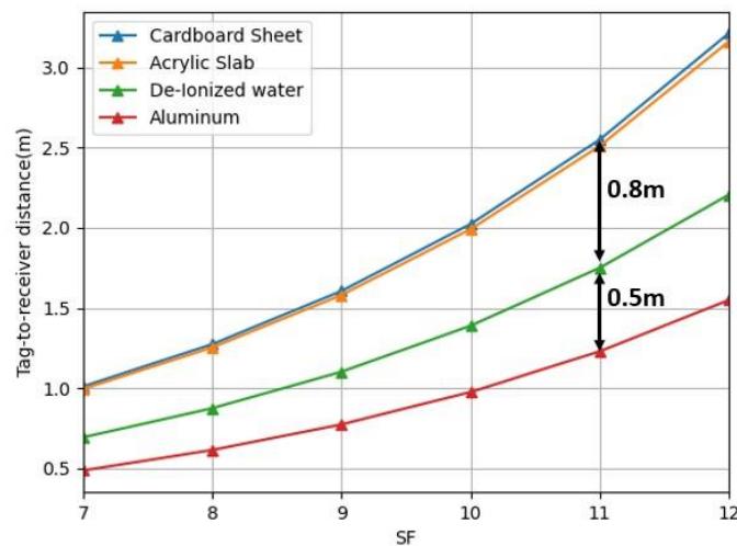 To further improve the LoRa backscatter communication range, a reflection amplifier can be used [35]. To evaluate the effect of the reflection amplifier on the communication distance, we compare the range with and without the reflection amplifier in the realistic LOS scenario, as shown in Figure 12. We can observe an increase in the range when a reflection amplifier is used. Next, we evaluate the effect of tag-on-object gain in the communication range. As discussed in Section 3.3.5, different materials have different impacts on the performance of tag communication. Figure 13 shows the communication range as a function of the spreading factor for a tag attached to various materials. The cardboard sheet has the best performance, which is close to one obtained using an Acrylic slab. For a source-to tag distance of $1\mathrm{m}$, the communication range of $180\mathrm{m}$ for an SF value of 12 is achieved for a cardboard sheet compared to only $83\mathrm{m}$ with aluminum. Note also that the impact of the material becomes important as the SF values increase. However, as we increase the source-to-tag distance, the effect of the attached material becomes negligible as shown in Figure 13d. There was only a decrease of 0.7 between the cardboard sheet and the aluminum.