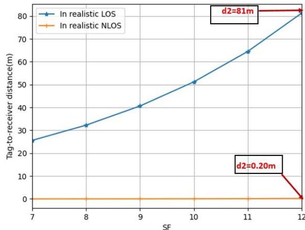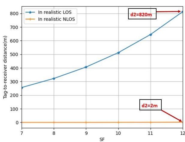 In some applications, the LOS cannot be guaranteed, hence we must account for the effect of path blockage between the transmitter and tag antenna, and between tag and receiver antenna. We compare the maximum theoretical communication range of LoRa backscatter technology in both LOS and NLOS as shown in Figure 15. We set the value of M at 6.48 which is the maximum value in Table 3, and the transmit power at 30dBm. As can be seen from the figure, for a source-to-tag distance of 1m and an SF of 12, the receiver can be as far as 820m for LOS while only a range of 2m is possible in NLOS scenario. As the tag is moved away from the source, this distance drops to only 8.12m and 0.02m for LOS and NLOS, respectively. This compromises the long-range wisdom of LoRa backscatter and