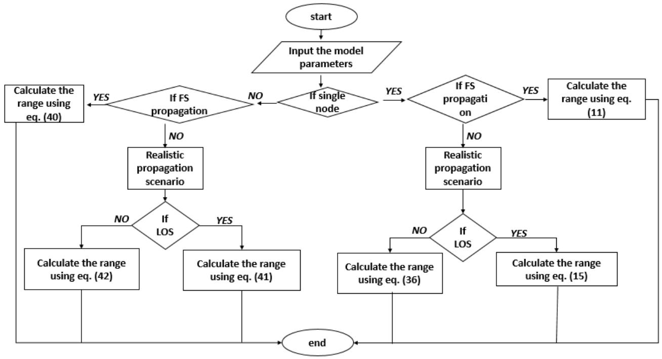 The flow chart of the proposed model is illustrated in Figure 1. At first, a single node communication is considered, where one transmitter communicates with one receiver. If the propagation channel is the free space environment, the theoretical
