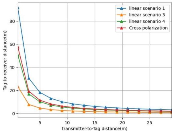 Antenna polarization is another cause of signal attenuation and hence limits the communication range. Figure 14 shows the communication range achieved in different polarizations. It can be noticed that the linear polarization in Scenarios 1 has a better communication range (about $97\mathrm{m}$ ) compared to linear scenarios 3 and 4. This is due to the fact that, in the linear polarisation of Scenario 1, the polarization mismatches $X_{f}$ and $X_{f}b$ are maximal ( $X_{f} = X_{f}b = 1$ ).