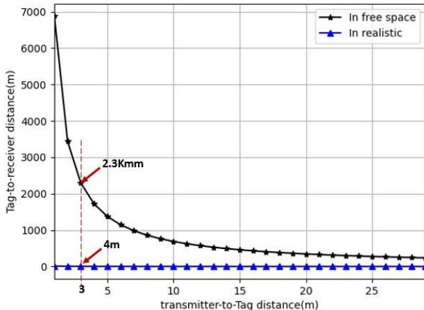 We compare the communication range of the free space model and the realistic scenario model in LOS (path blockage ignored) using Eq. (11) and (15). In Figure 11, it can be seen that the achieved range in the realistic case is much lower than that of the free space case. For example, for a source-to-tag distance of $3\mathrm{m}$, a communication range of $2.3\mathrm{km}$ is achieved, compared to only $4\mathrm{m}$ for the realistic LOS scenario using unit antenna gain for both transmitter, the tag, and receiver. This difference becomes important as the tag is brought close to the transmitter.
