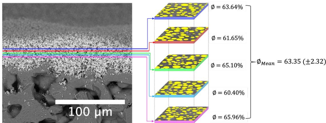 $(\phi)$ distribution through image processing analysis showing a homogeneous porous medium along the membrane thickness