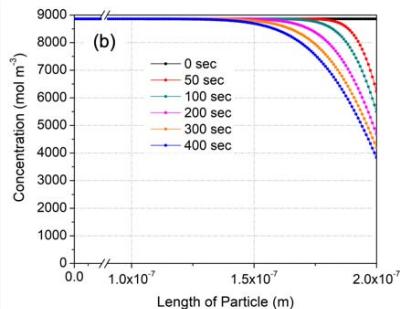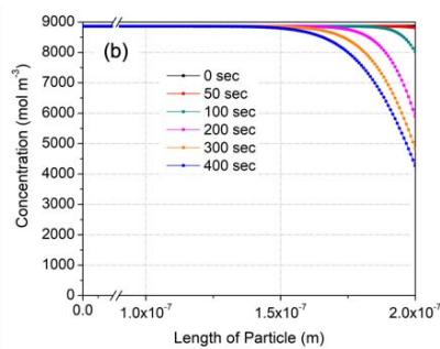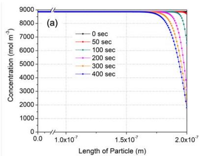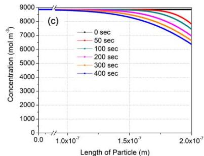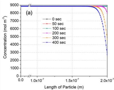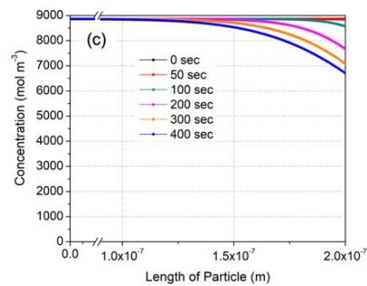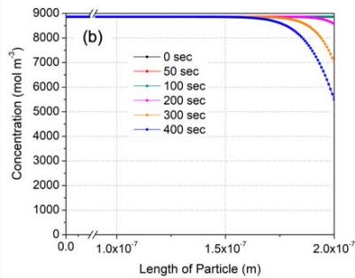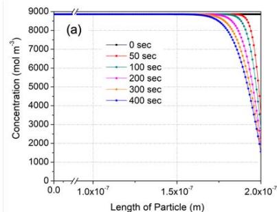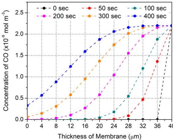 Figure 13 shows variation of CO concentration distributions along the flow direction with respect to time from the beginning to an elapsed time of 400 seconds at 175, 200 and $225^{\circ}\mathrm{C}$ using the fitting parameters obtained above. Here, the working gas flows from the right to the left with a superficial velocity of $20~\mathrm{mm / s}$, and the concentration of CO at the right-hand side is fixed at $2.2 \times 10^{-9} \mathrm{~mol} / \mathrm{m}^{3}$ (44 ppm). The concentration of introduced CO was decreased along the thickness by CO oxidation in the membrane, even at $175^{\circ}\mathrm{C}$ (Fig. 13(a)). There was no emission of CO for up to 100 seconds, although this doesn't agree with the experimental results. However, the CO concentration in entire region of the membrane was increased with respect to time due to a decreased oxidation rate even under an isothermal oxidation condition. Then, 400 seconds later, a high level of CO was emitted in the case of $175^{\circ}\mathrm{C}$ (Fig. 13(a)). With increased temperature, from 175 to $225^{\circ}\mathrm{C}$, the emission at 400 seconds was less since more CO was oxidized.