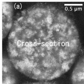 However, using a back-scattered electron mode, a non-homogeneous composition distribution was observed, as shown in Fig. 5(a). In this figure, the bright colored areas are ceria-zirconia (CZ) particulates since CZ has the highest atomic number compared to the other components of the slurry. The dark gray areas were identified as aluminum oxide particulates. The ratio of these areas was analyzed using Image-J program. The results presented in Fig. 5(b) revealed that the average CZ-particulate area occupied approximately $50\%$ of the whole cross-sectional area of a single agglomerated TWC particle.