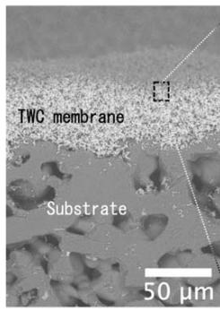A scanning electron microscopic (SEM) cross-sectional image of a TWC particle membrane filter on a substrate is presented in Fig. 4. The thickness of the membrane layer is approximately 40 microns in which the agglomerated TWC particles (arithmetic mean diameter of $1.2\mathrm{um}$ ) are percolated. The porosity of the membrane was measured as approximately $64.4\%$ [17]. The size of the agglomerated TWC particles was controlled by adjusting the weight percentage of the primary TWC particulates in the slurry. The primary TWC particulates are homogeneously dispersed throughout the entire cross-sectional area of a single agglomerated TWC particle, as shown in the SEM images of Fig.
