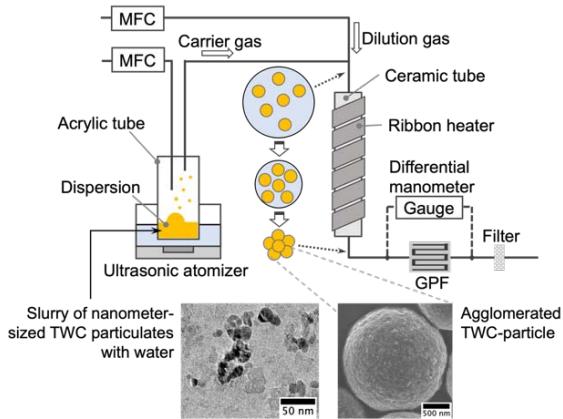 substrate. The experimental procedure and fabrication process were discussed in detail in the previous literature [17]. The slurry used in its fabrication was comprised of 20 wt.% of primary nanometer-sized TWC particulates prepared using distilled water. These particles had an average diameter of approximately 200 nm, as shown in the TEM image in Fig. 3. The chemical composition of the primary TWC-particulates is the same as that of a commercial monolith converter, as shown in Table 1. The TWC particulate slurry was introduced into an acrylic tube to generate small droplets with a size range of 5-10 um using an ultrasonic atomizer (60 Hz frequency). Nitrogen gas was introduced into the acrylic tube at a flow rate of $50~\mathrm{mL / min}$ to transport the atomized water droplets, including TWC particulates from the tube. The gas-suspended droplets containing TWC particulates were then mixed with a dilution gas to achieve a superficial velocity of $5\mathrm{mm / s}$ and a humidity lower than the dew point, even at room temperature. Nitrogen gas-diluted dispersed water droplets were introduced into an evaporator, which was kept at constant temperature of $280^{\circ}C$ using a ribbon heater. Since only water was vaporized, the primary TWC particulates agglomerated, as shown in the SEM image of Fig. 3. The agglomerated nitrogen dispersed TWC particles, ranging in size from 1 to $2\mu m$, were deposited as a membrane layer onto a miniaturized filter substrate. Then, as in our previous study, the fabricated membrane filter was sintered at $900^{\circ}C$ for 4 hours to maintain the percolation structure of the TWC membrane with a minimal peeling rate [27].
