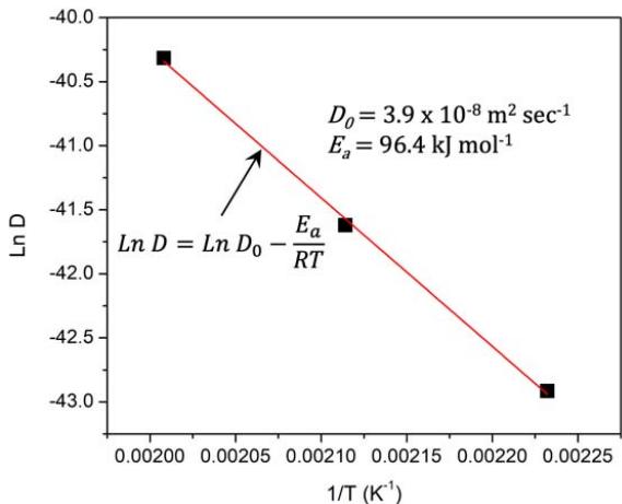 The experimental results show that the logarithmic function of the diffusion rate was proportional to the inverse of absolute temperature. From this linearity, the Arrhenius-type expression is suitable for representing the diffusion of oxygen atoms over the temperature range of the current study. The diffusion coefficient is an Arrhenius type expression described in Eq. 5, where $D_{\mathrm{o}}$ is the pre-exponential diffusivity and $E_{a}$ is the activation energy for diffusion.