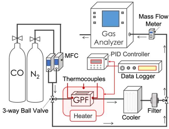 Figure 6 shows a schematic diagram of an isothermal CO oxidation experimental setup. A working gas consisting of CO (44 ppm) with the balance as $\mathsf{N}_2$, was introduced (with no oxygen supplied in the working gas) through the TWC particle membrane at a superficial velocity of $20~\mathrm{mm / s}$ and temperatures of 175, 200 and $225^{\circ}C$ to investigate the transport of oxygen atoms in the TWC particles. Temperature was measured using a thermocouple inserted in an outflow channel of the substrate filter. It was fixed by an electric heater with a PID feedback system. The concentrations of CO and $\mathsf{CO}_{2}$ were measured as a function of time using an infrared gas analyzer after the gas stream was passed through the membrane. The supplied CO concentration was calibrated after each measurement under each temperature condition using a by-pass line. Before the experiment, all pre-adsorbed gas molecules on the catalyst surface were removed by passing $\mathsf{N}_2$ gas through the membrane.