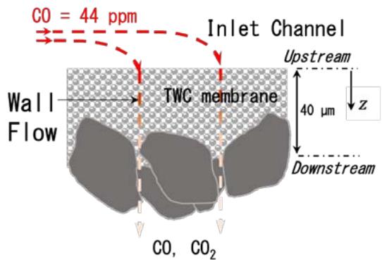 Figure 8 shows a schematic diagram of streamlines in the membrane filter. Here, the working gas is fed into the membrane layer through an inlet channel in a wall-flow pattern in a uniformly distributed manner. Assuming a one-dimensional, incompressible and uniform flow with a characteristic velocity (superficial velocity) at the membrane layer, only a decrease in CO concentration through oxidation should be considered along the flow direction (in the $z$ -direction). Additionally, it was hypothesized that CO reacts with oxygen atoms diffused from the inside of the CZ material, and the reaction occurs at the TWC particle surfaces as follows.