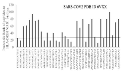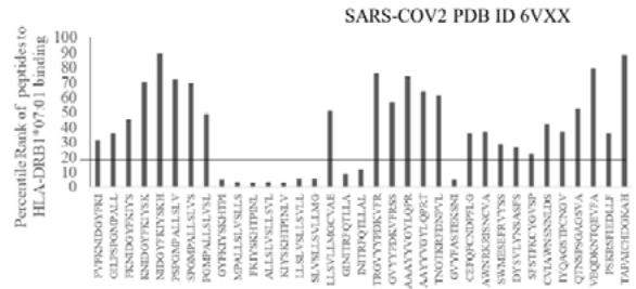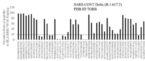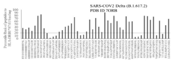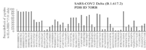 Fig.1B Fig.1 A, B: Selection of immunogenic T cell specific epitopes by HLA-DRB1 alleles from Spike envelop protein of (A) SARS-COV2 (6VXX_A) and (B) Delta variant (B.1.617.2) virus. The Spike envelop proteins are selected from protein database. The 60 amino acid peptide strings are processed by Immune Epitope Database (IEDB) Tool software system. The tool was programmed for detecting 12 amino acid epitope peptides responding to HLA-DRB1*03:01, HLA-DRB1*07:01 and HLA-DRB1*15:01 alleles representing population based immunogenic responses. (A) Immunogenic Spike epitopes from SARS-COV2 6VXX_A protein are mapped on the basis of percentile rank determining binding affinity to HLA-DRB1. The base line of 20 percentile range is shown in the plot. The epitopes below this line are low immunogenic and good fit to corresponding HLA-DRB1 alleles. (B) Immunogenic Spike epitopes from Delta variant (B.1.617.2) are mapped in a similar way and scaled through 20 percentile base line. The low rank immunogenic peptide epitopes are found below 20 percentile rank line. Each bar in the plot represents percentile HLA-DRB1 alleles 03:01, 07:01, 15:01 responses to each of the peptide epitopes presented in the figure.