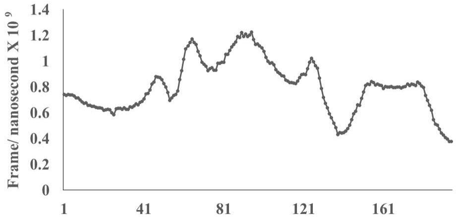 Omicron epitope M370 vs MAIT TCR Fig.3H Rendering Time X $10^{9}$ nanosecond Fig.3 A, B, C, D, E, F, G, H: Epitope peptides of Omicron variant (B.1.1.529) bind with mucosa-associated invariant T cell receptor (MAIT-TCR). The molecular docking and molecular dynamics experiments are performed to determine specific binding nature of Omicron epitopes and MAIT-TCR. The closest aligned atoms of amino acids within the cut off distance 2 Angstrom are determined by 10 cycle Molecular Dynamics alignment assay using the epitopes as mobile unit and MAIT-TCR is the target for none to one interaction. The root mean square deviation (RMSD, Angstrom) for each experiment between epitope peptide and MAIT-TCR demonstrate good fit alignment. The lesser RMSD, the better is the alignment thus represents better binding. The protein database files (PDB) are used in the experiments. (A) The molecular docking of Omicron variant Spike epitope (PDB: OM42) with MAIT-TCR (PDB: 4L9L). The interacting protein sequences are shown in a box at the top of the figure. The binding of OM42 by MAIT-TCR is shown in a box in the figure. (B) The molecular dynamics experiment demonstrates binding pattern of interacting atoms between OM42 (PDB) and MAIT-TCR (PDB: 4L9L). RMSD: 6.612 Angstrom. (C) The molecular docking of Omicron variant Spike epitope (PDB: OM60) with MAIT-TCR (PDB: 4L9L). The interacting protein sequences are shown in a box at the top of the figure. The binding of OM60 by MAIT-TCR is shown in a box in the figure. (D) The molecular dynamics experiment demonstrates binding pattern of interacting atoms between OM60 (PDB) and MAIT-TCR (PDB: 4L9L). RMSD: 7.282 Angstrom. The RMSD value shows comparatively less aligned amino acid sequences are present in OM60 epitope in the aspect of interaction with MAIT-TCR. (E) Molecular docking of Omicron variant Spike epitope (PDB: M312) with MAIT-TCR (PDB: 4L9L). The interacting protein sequences are shown in a box at the top of the figure. The binding zone of epitope peptide with MAIT-TCR is shown in a box in the figure. (F) The molecular dynamics experiment demonstrates binding of interacting atoms between M312 (PDB) and MAIT-TCR (PDB: 4L9L). RMSD: 6.131 Angstrom. (G) Molecular docking of Omicron variant Spike epitope (PDB:M370) with MAIT-TCR (PDB: 4L9L). The interacting protein sequences are shown in a box at the top of the figure. The binding of M370 by MAIT-TCR is shown in a box in the figure. (H) Molecular dynamics experiment demonstrates binding pattern of interacting atoms between epitope M370 (PDB) and MAIT-TCR (PDB: 4L9L). RMSD: 6.364 Angstrom. All these interaction events in the Molecular Dynamics experiments are based on oscillation atoms of interacting proteins defined at the rate of 30 frame per nanosecond for 100 nanosecond duration as described in Materials and Methods. All results are expressed as Frame per nanosecond versus Rendering time (nanosecond) at a particular executive root mean square deviation (RMSD) value. Statistical significance $(p < 0.05)$ of the frame per nanosecond values of experimental epitope peptides as compared with unrelated control peptide antigen85 with respect to MAIT-TCR has been determined by one factor ANOVA.