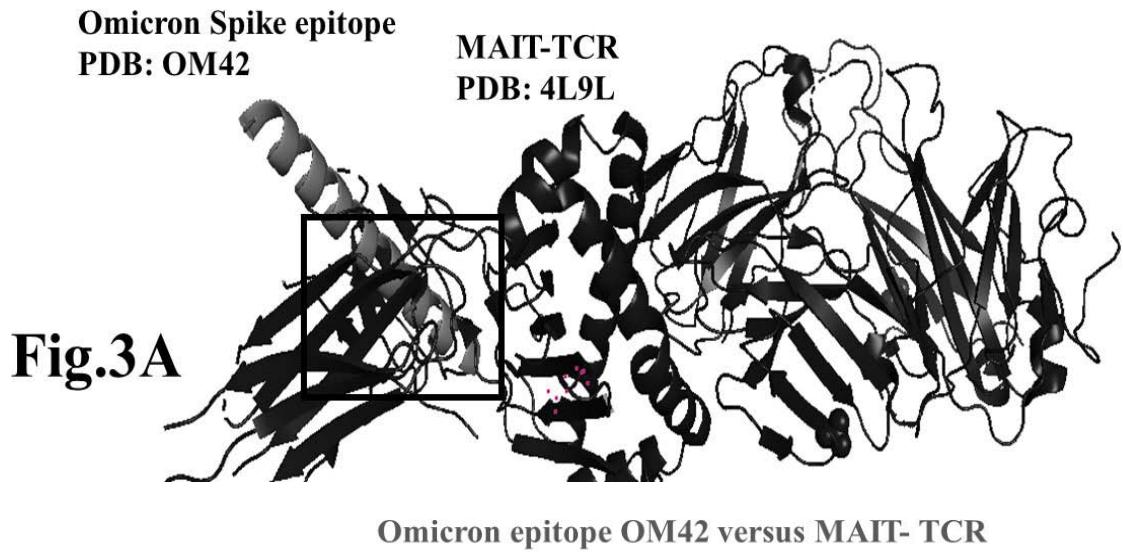 The results presented in figure 3 A demonstrate an aligned binding between Omicron Spike epitope (PDB: OM42) and MAIT- TCR (PDB: 4L9L) sequences. The arrowhead and a square box show the region of binding of OM42 with TCR protein sequence. The digital experimentation using Schrodinger PyMol software identified 1-6 amino acid sequence in TCR binds with OM42 Omicron epitope (the square box indicates aligned amino acid sequences). The 100-nanosecond run with 30 frames/ nanosecond output for 10 cycles demonstrates atom to atom interaction profile between target TCR and mobile OM42 (Fig.3B). The executive root mean square deviation (RMSD) value 6.612 Angstrom shows relative differences between interacting atoms from epitope OM42 and TCR 4L9L. The epitope OM60 binds with MAIT- TCR at 1-26 amino acid region (square box shows the sequence interactions) (Fig.3C). Corresponding molecular dynamics show higher root mean square value (RMSD: 7.282) (Fig.3D). The observation indicates less alignment between interacting atoms of OM60 and TCR 4L9L.