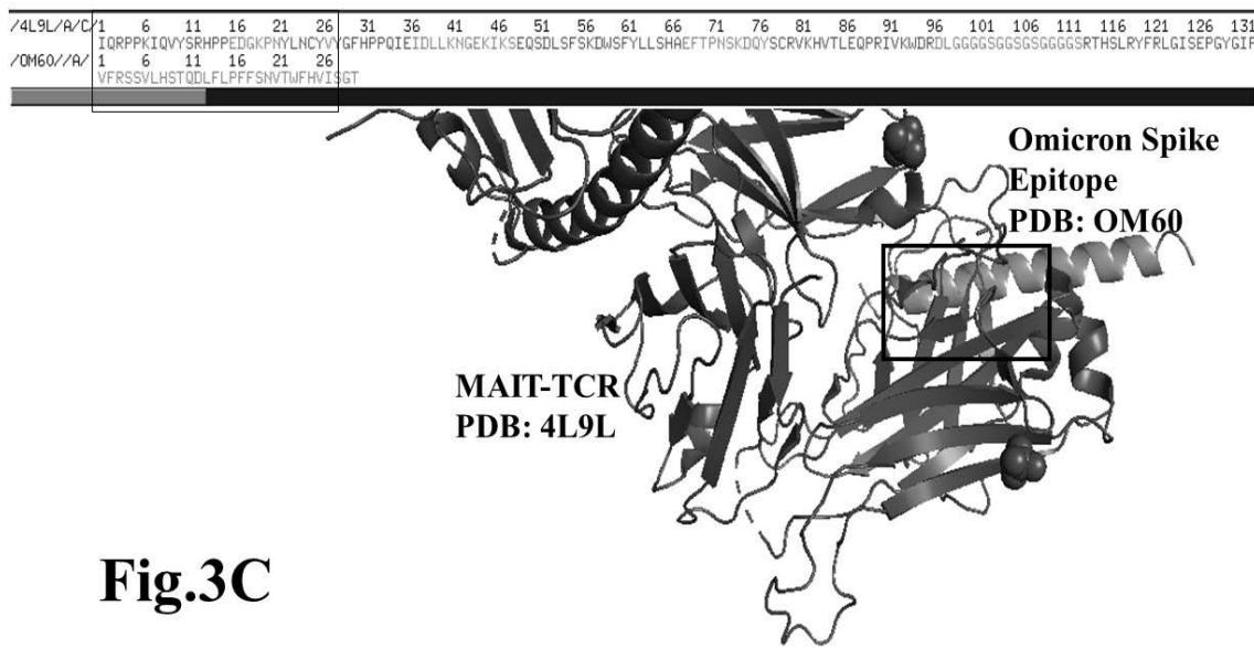 - The N-terminal first 900 amino acid Spike protein sequence is selected from NCBI protein databases (SARS-COV2: 6VXX_A, Delta variant (B. 1.617.2): 7ORB_R, Omicron (B.1.1.529): 7Q09_A. The protein sequence was processed by NCBI protein blast (pblast) software engine to determine 60 amino acid peptide strings. The randomly selected 25-30 Spike peptide strings containing epitopes were processed for protein database (PDB) file by using Avogadro (USA). The Omicron Spike epitope PDB files: OM42, OM60, M312, M370 and SARS-COV2 (6VXX_A)-Delta variant (7ORB_R) overlapping CD4 immunogenic epitope -PDB file DLT1, Delta variant (7ORB_R) epitope DLT2 (Table 1) are used to determine close alignment and binding efficiency with mucosa associated invariant T cell receptor Vα7.2Vβ7.2 (MAIT-TCR).