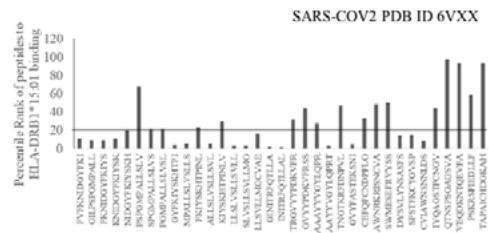 The results presented in the Figure 1 show differential responses of screened N-terminal Spike epitopes of SARS-COV2 (ID 6VXX_A) (Fig.1A) and Delta variant (7ORB_R) (Fig.1B) towards HLA-DRB1 alleles 03:01, 07:01 and 15:01. The bar diagrams with epitope database analysis tool (IEDB) percentile ranks demonstrate a base line of 20 percentile; below which the epitopes are low immunogenic and good fit to HLA-DRB1 alleles. These epitopes have ability to induce moderate to low CD4 responses. The results showed overlapping recognition of epitope LYNSASFST (derived from 6VXX_A and 7ORB_R) by HLA-DRB1*03:01 and HLA-DRB1*15:01 (< 20 percentile rank) for SARS-COV2 and Delta variant. HLA-DRB1*07:01 recognition of the same epitope showed marginally over than 20 percentile rank. The epitope has lower rank (45.38232) when it is recognized by HLA-DRB1*15:01 and HLA-DRB1*03:01. The epitope YFKIYSKHT (rank: 42.8908) derived from SARS-COV2 Spike protein (ID 6VXX_A) is recognized by HLA-DRB1*15:01 and HLA-DRB1*07:01 while another epitope peptide VSLLSVLLM/ LVSLLSVLL (rank: 50.16648/ 52.20664) is recognized by all three tested HLA- DRB1*03:01, HLA-DRB1*07:01 and HLA-DRB1*15:01alleles. The specific recognition by HLA-DRB1*07:01 and HLA-DRB1*15:01 allele is detected for Delta variant epitope FASYAWNR (rank: 43.9931), YAWNRKRIS (rank: 40.04248), YRLFRKSNL (34.09812). These HLA-DRB1 selected Spike epitopes from SARS-COV2 and Delta variants are immunogenic to CD4 T cells in human populations.