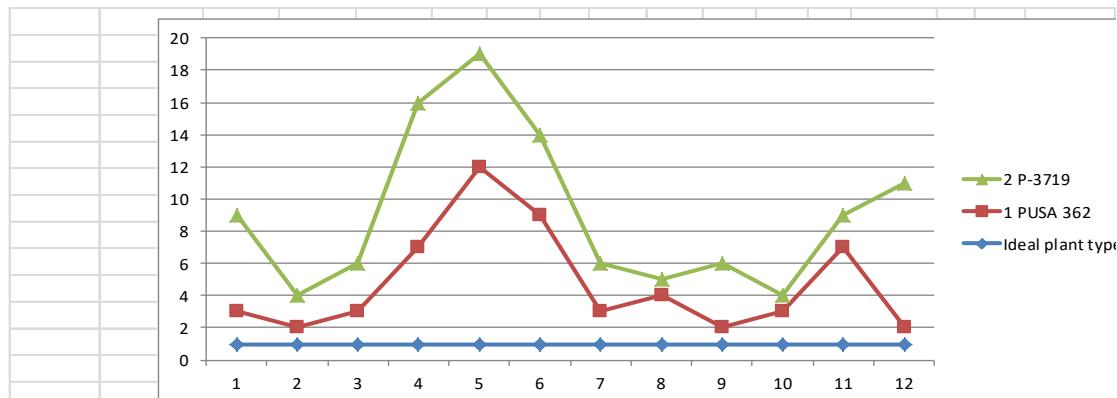 From tables 3 & 5, it is clear that the preference order of evaluated chickpea genotypes is PUSA 362, P-3719, CSG 515, E-100YM, ICC 16015, GNG 1518, RADHA, IPC 94-94, ICC 15850, ICC 3535, ICC 1009 and KWR 108. Top five varieties viz., PUSA 362, P-3719, CSG 515, E-100YM and ICC 16015 could be recommended for cultivation by farmers of this region. Top two varieties were compared with ideal plant type and the graphical presentation shows how close are the top two varieties to the ideal plant type as shown in Figure 1.
