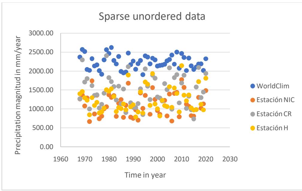 We worked with precipitation data in raster format from regional WorldClim in Central America, precipitation data measured from the Nicaraguan airport station, precipitation data measured from the El Indio coffee station, San Vito-Puntarena in Costa Rica, and precipitation data measured from the Amapala station in Honduras.