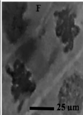 $A = 0\mu g / ml$ (control); $B = 5\mu g / ml$; $C = 10\mu g / ml$; $D = 20\mu g / ml$; $E = 30\mu g / ml$; $F = 40\mu g / ml$.