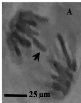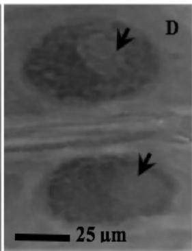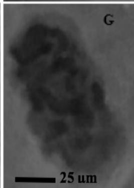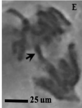 Figure 2: Mitotic and chromosomal aberrations (CA) (arrowed) induced in Allium cepa root tips by aqueous extracts of the roots of C. melo. A and B=Anaphase laggard; C= Disoriented Anaphase; D= Nuclear vacuoles; E=Anaphase Bridge; F=Sticky chromosomes; G=Mature cell showing puff; H=binucleated cell