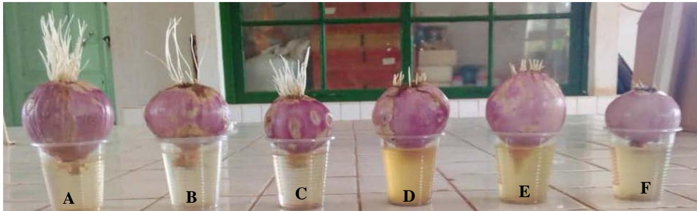 Figure 1: Examples of series of onions (A. cepa) cultivated for 96 h in different concentrations of the aqueous extracts of Cucumis melo