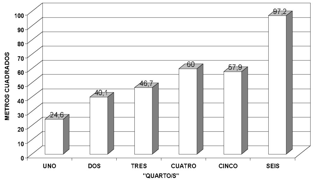 y $579 \ \mathrm { m } ^ { 2 }$, de promedio. A la postre, los hogares que disfrutaban de seis «quartos» desplegaban su existencia cotidiana en un promedio de $972 \mathrm { m } ^ { 2 }$.