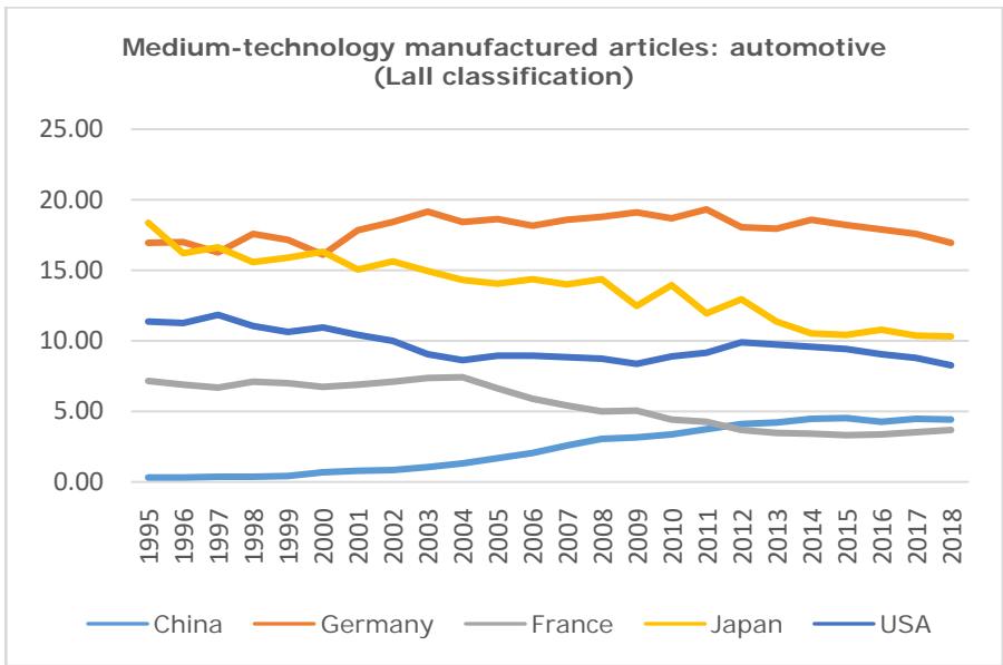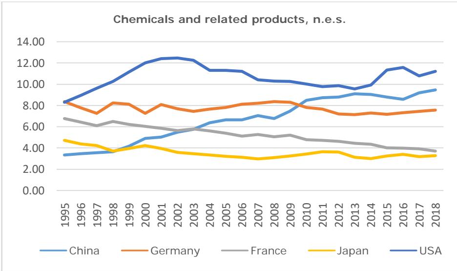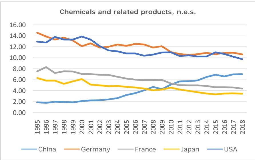 Figure 3: Changes in the Export Profile of China, the USA, Japan, France and Germany Over the Period 1995-2018
