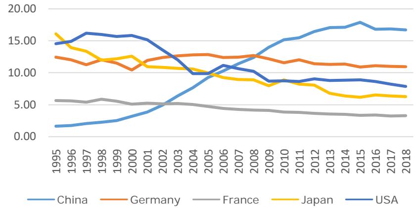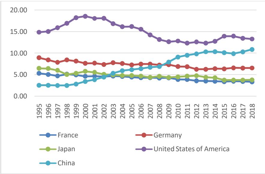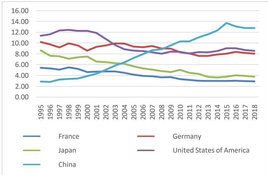 Sources: UNCTAD data and author's calculations Figure 1: Trends in the Share of China, the United States, Japan, Germany and France in World Exports Over the Period 1995-2018