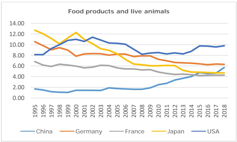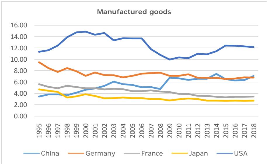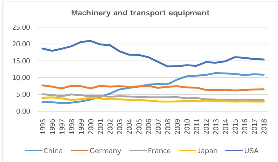 Secondly, China is gradually becoming the major player in international trade in high-value-added products in terms of proportion. China's share of exports and imports of these strategic products has risen sharply, often outstripping that of the USA. For example, China's weighting in world exports of machinery and transport equipment, manufactured goods and miscellaneous manufactured goods. Specifically, in 1995, China's total weight for these three items was $14.06\%$ of world exports, compared with $61.31\%$ in 2018. Similarly, China's share of world imports has also risen, from $9.54\%$ in 1995 to $27.42\%$ in 2018. Figures 3 and 4 illustrate China's gradual dominance in terms of the proportion of product categories.