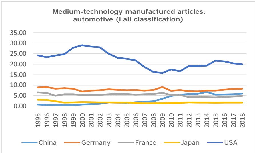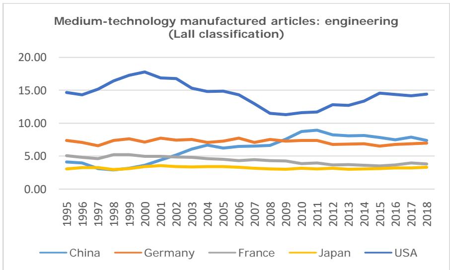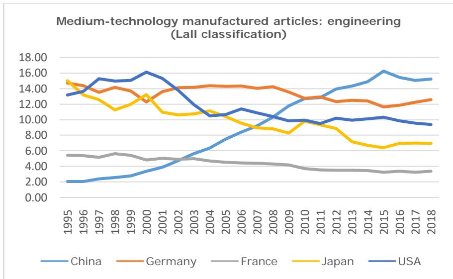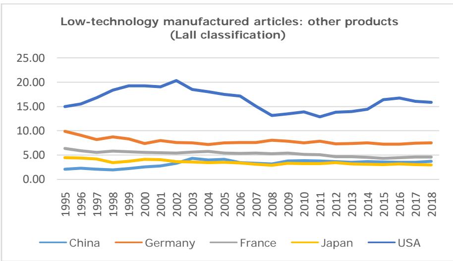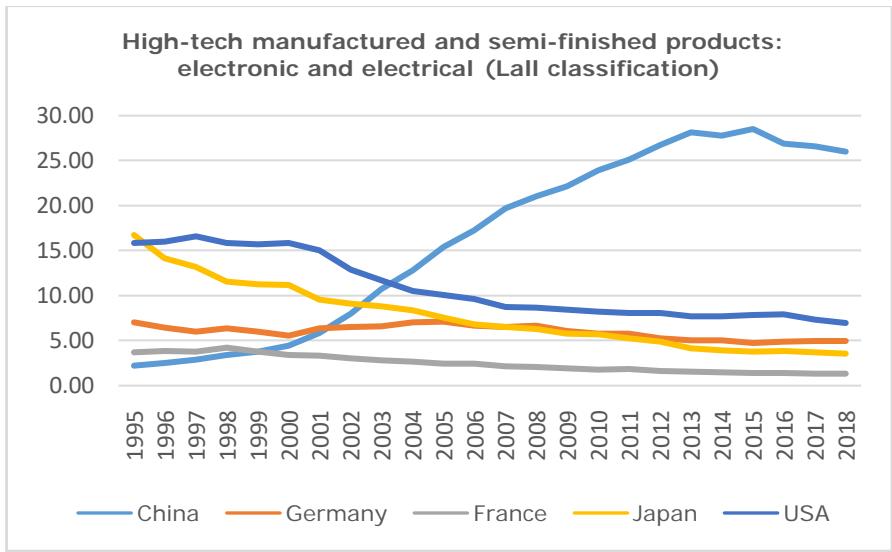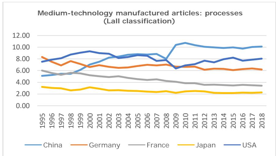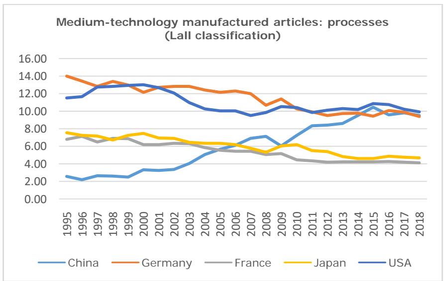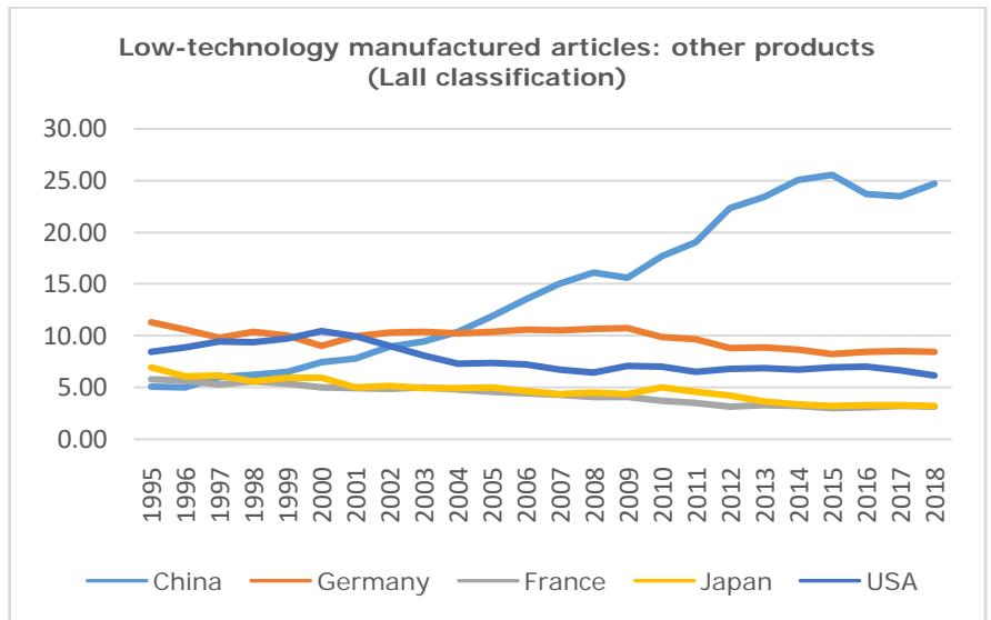 An analysis of exports and imports of products by manufacturing technology (Lall classification) confirms China's gradual and definite domination of strategic and high-value-added products. Indeed, an analysis of export statistics shows that Chinese exports have caught up with and even surpassed those of the USA, Germany and Japan, for example, in the following technology-based product categories: Manufactured articles from natural resources (agri-food), Low-technology manufactured articles (textiles, clothing and footwear processes), Medium-technology manufactured articles (processes and engineering), High-technology manufactured and semi-finished articles (electronics and electrical). In addition, analysis of its import statistics shows China's dominance over the world's leading trading economies such as the USA, Germany and Japan in the following technology product categories: primary products, other manufactured goods of natural origin (these two categories are mainly made up of raw materials), medium-technology manufactured goods (processes), high-technology manufactured and semi-finished goods (electronic and electrical), other high-technology manufactured goods (such as optical apparatus and equipment, measuring and control apparatus and equipment, etc.). The last three categories of products are also inputs, to which a final category must be added, containing non-monetary gold, printed matter, non-legal tender, works of art and antiques, etc.