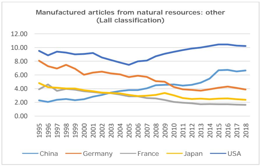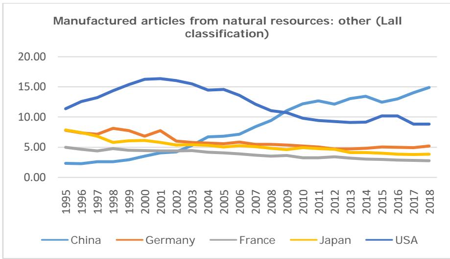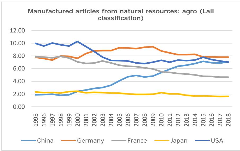 Figure 5: Evolution of the Export Profile According to the Lall Classification of China, the USA, Japan, France and Germany over the Period 1995-2018