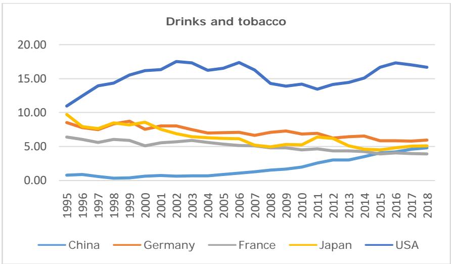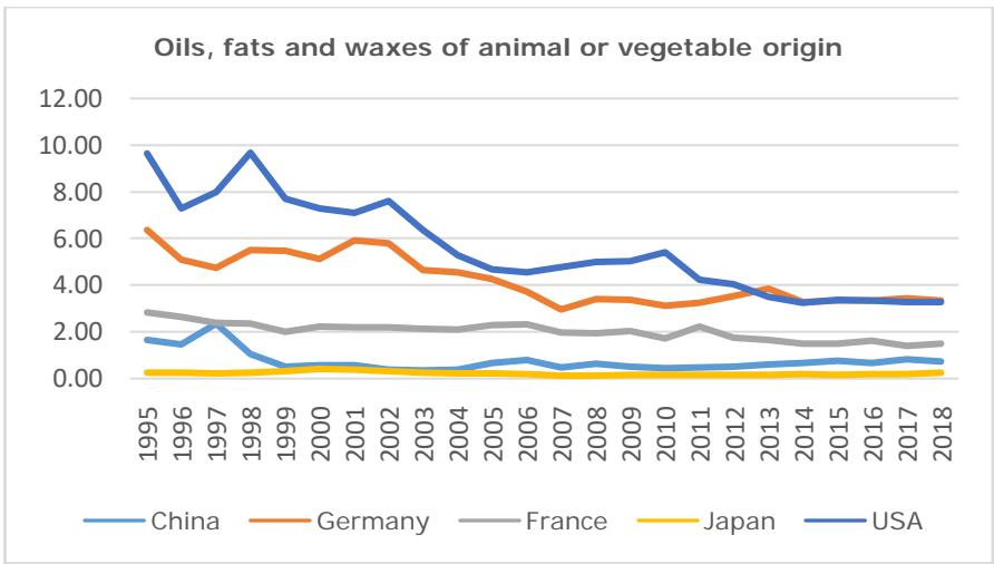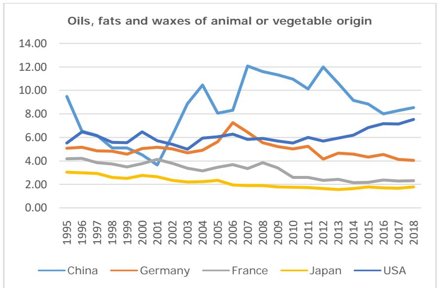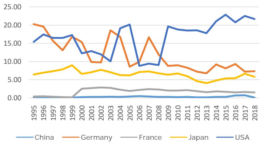 Figure 4: Evolution of the Import Profile of China, the USA, Japan, France and Germany over the Period 1995-2018
