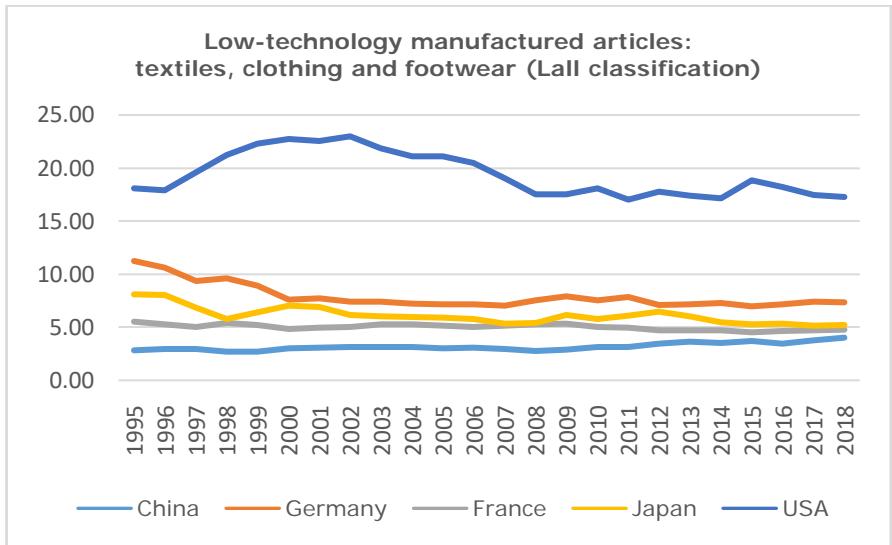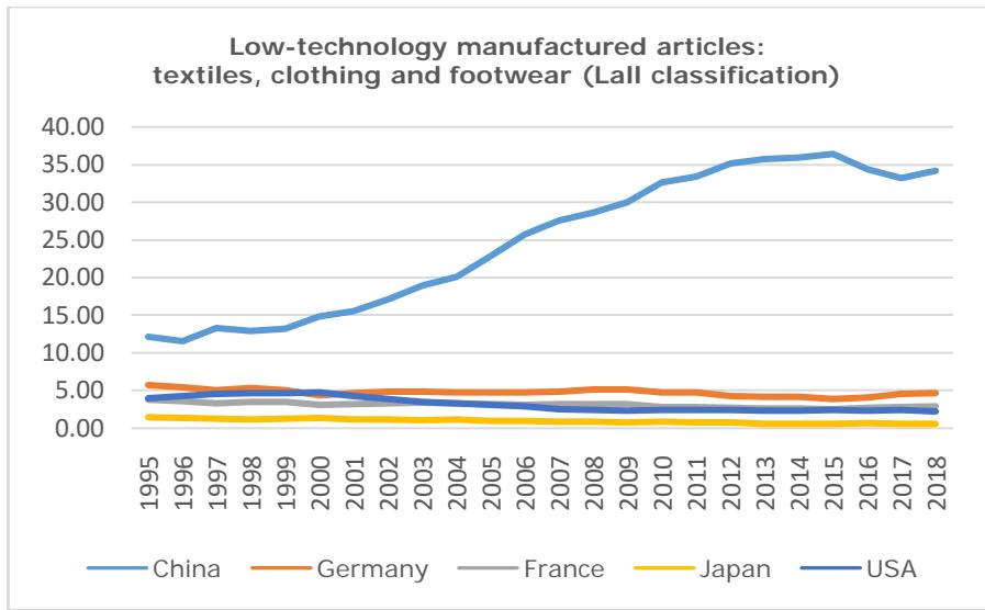 - This is to be expected, as China is still a newly industrialised country and has not yet got rid of low value-added technologies such as textile and clothing manufacturing.