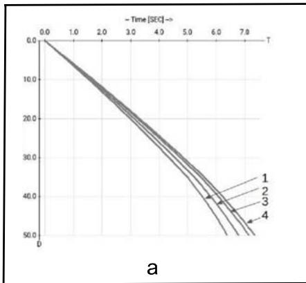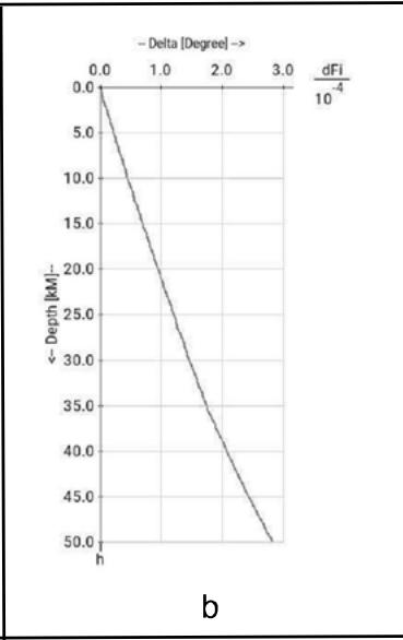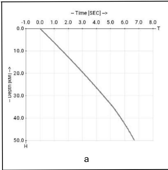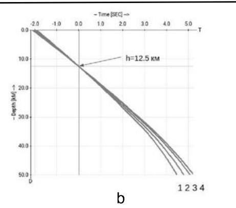 Fig. 2 present the dependence from depth of the origin time on a characteristic $t_m^0 (r_m,h)$. Fig. 2.a are presented graphs for four epicentral distances. The epicentral distances are: line $1 - r_{m} = 25^{\circ}$, line $2 - r_{m} = 50^{\circ}$, line $3 - r_{m} = 75^{\circ}$, line $4 - r_{m} = 100^{\circ}$.