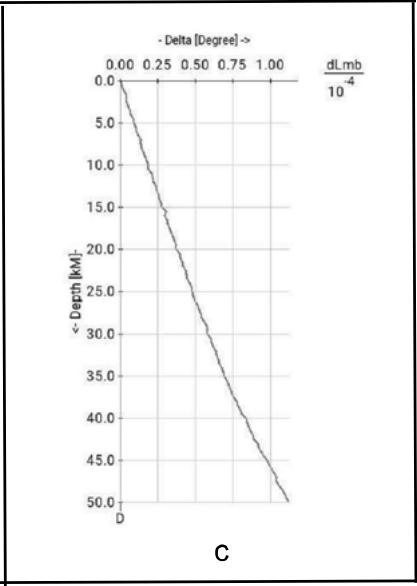 Fig. 1: Rupture line example for event 2022-01-07 17:45:34 in China. This is not a real rupture on this line, this is the geometrical places (locus) hypocentre coordinates in dependence of depth. Each hypocentre is calculated for a fixed depth. Each coordinate (except depth) is plotted as a difference of its value on depth and its value on the zero depth: (a) - origin time coordinate values, (b) - latitude values, (c) - longitude values. Depth range - from zero up to $50km$.