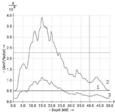 The result of the location procedure is presented in Fig. 5. This result was obtained from processing of the data of the event 2022-01-07 17:45:34 in China. That is an example of using both seismic phases $P$ and $pP$. Fig. 5 presents three graphs of $AmP$: curve 1 - graph of $AmP^{(P)}$, curve 2 - graph of $AmP^{(P)}$, curve 3 - graph of expression.