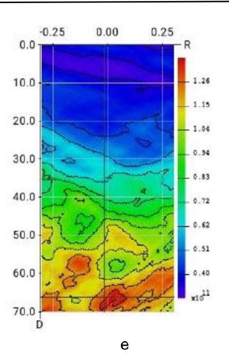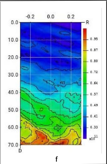 $(A, B)$ line; series presented for times: b- $t_p = 0$ sec, c- $t_p = -1$ sec, d- $t_p = -2$ sec and e- $t_p = -5$ sec, f- $t_p = -7.5$ sec, where $t_p$ precursor time before $t_{0h=0}^{\mathcal{W}}$. Time corresponds to the time axis on Fig.10.b. These figures were plotted by using the (11) algorithm of amplitude coordinations.